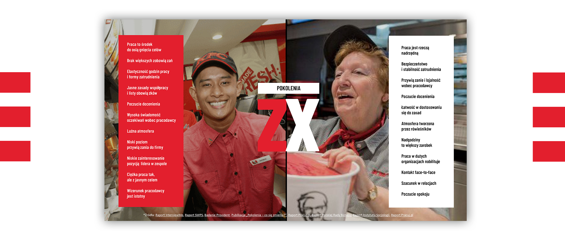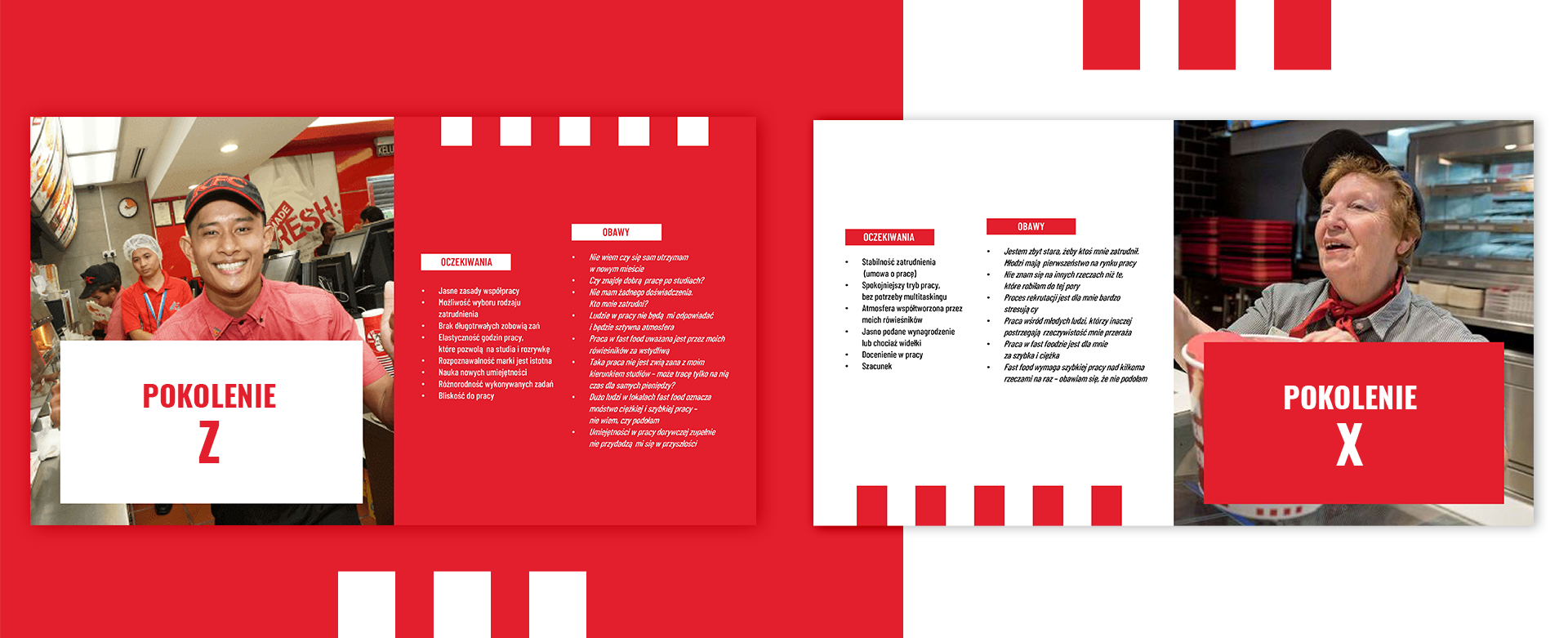 Jak sami zauważyliście podczas wizyt w restauracjach typu fast food, pracownikami tychże sieciówek są nie tylko młodzi studenci, ale także ludzie w wieku średnim szukający nowej ścieżki kariery. Za cel w naszej kampanii dla KFC przyjęliśmy skuteczne dotarcie do jednych i drugich. Aby to zrobić, musieliśmy dokładnie zdefiniować te dwie grupy, a konkretniej ich podejście do pracy.